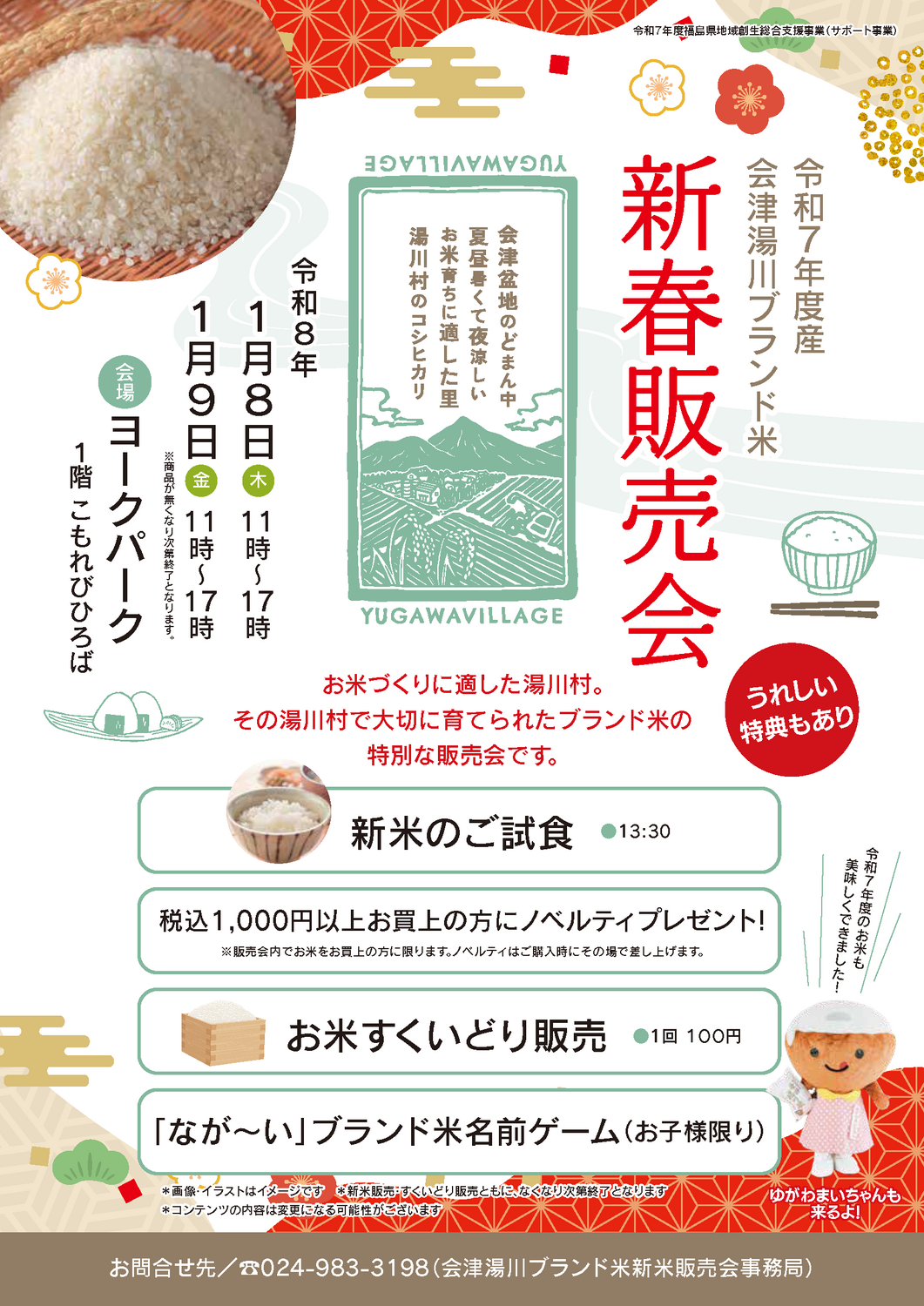 1階こもれびひろばで、2026年1月8日(木)と9日(金)、湯川村ブランド米新春販売会を開催します。