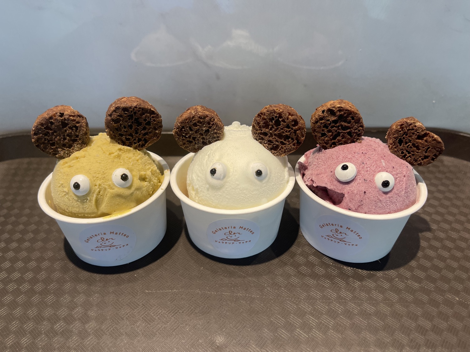 ボーロの目とチョコ菓子のお耳がついたカワイイモンスターのジェラートです。
