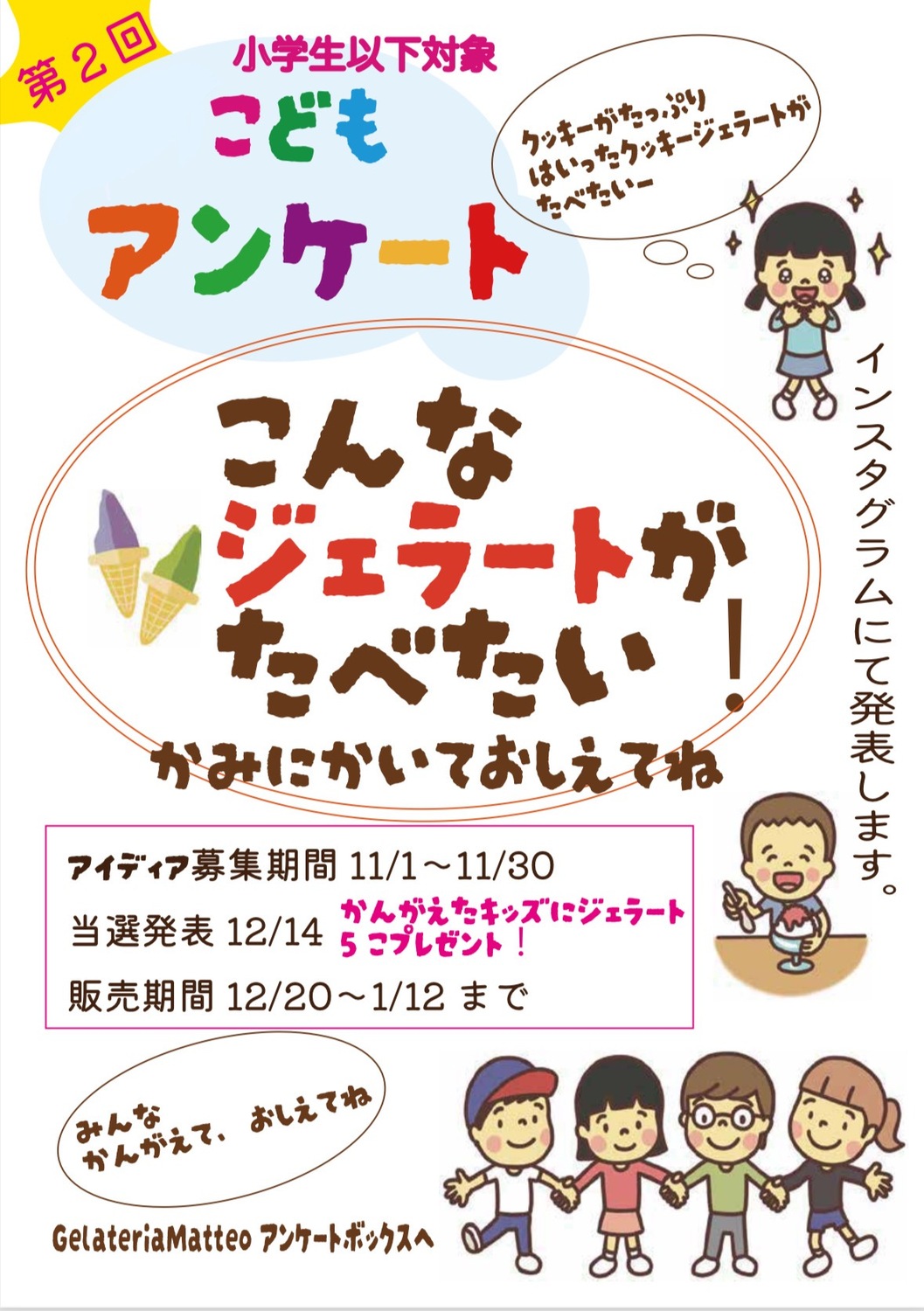 現在マッテオでは、夏にも沢山のお子様にご参加頂いた好評企画『こんなジェラートがたべたい!』こどもアンケートを実施中です!
